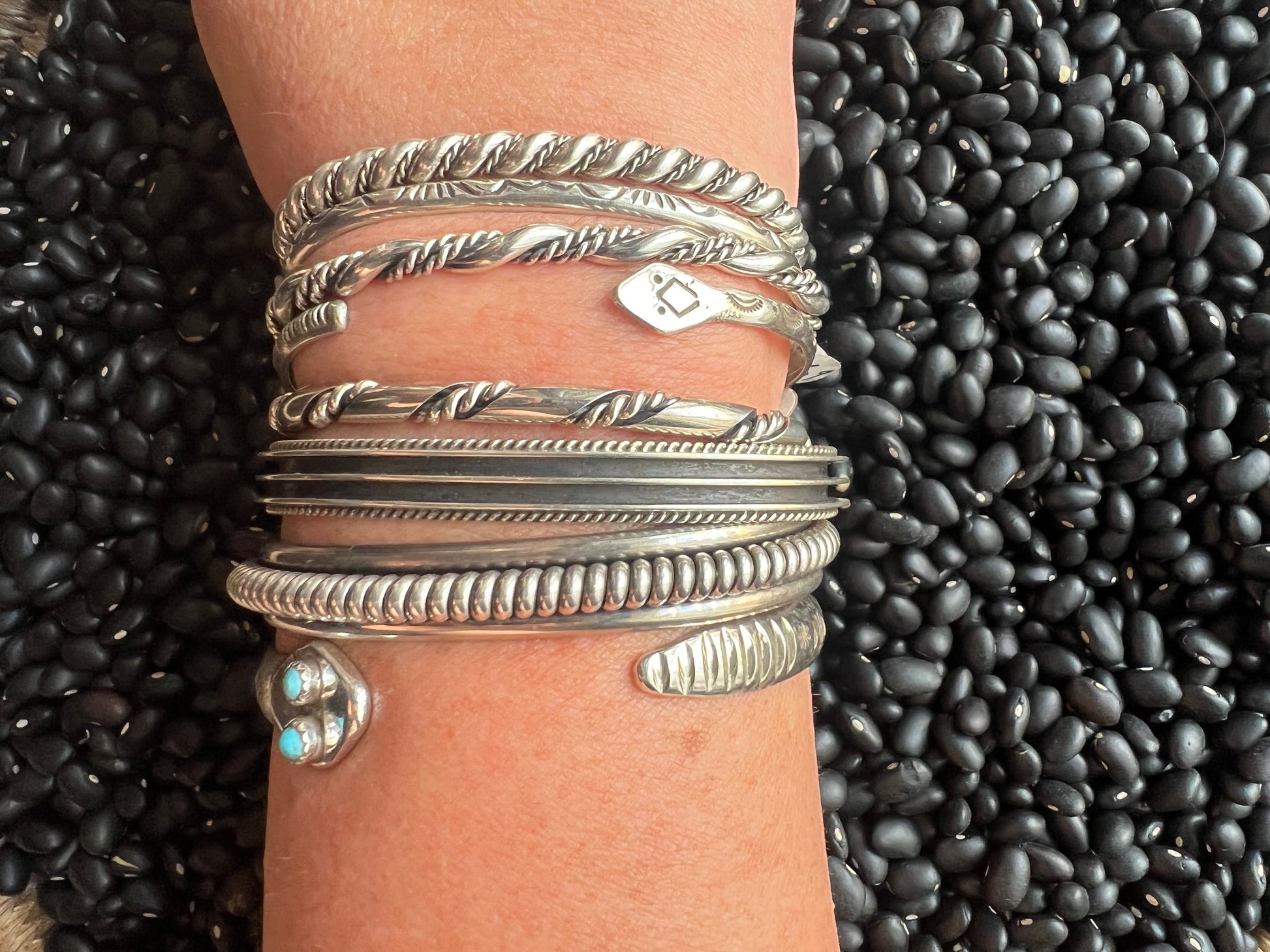 Native American made sterling silver cuff. Hand stamped making each one is unique. Perfect to add To your stack ! These are hand stamped and then dipped in patina so the stamp pops with the look of being vintage. If there is one in particular you want please DM me on IG!