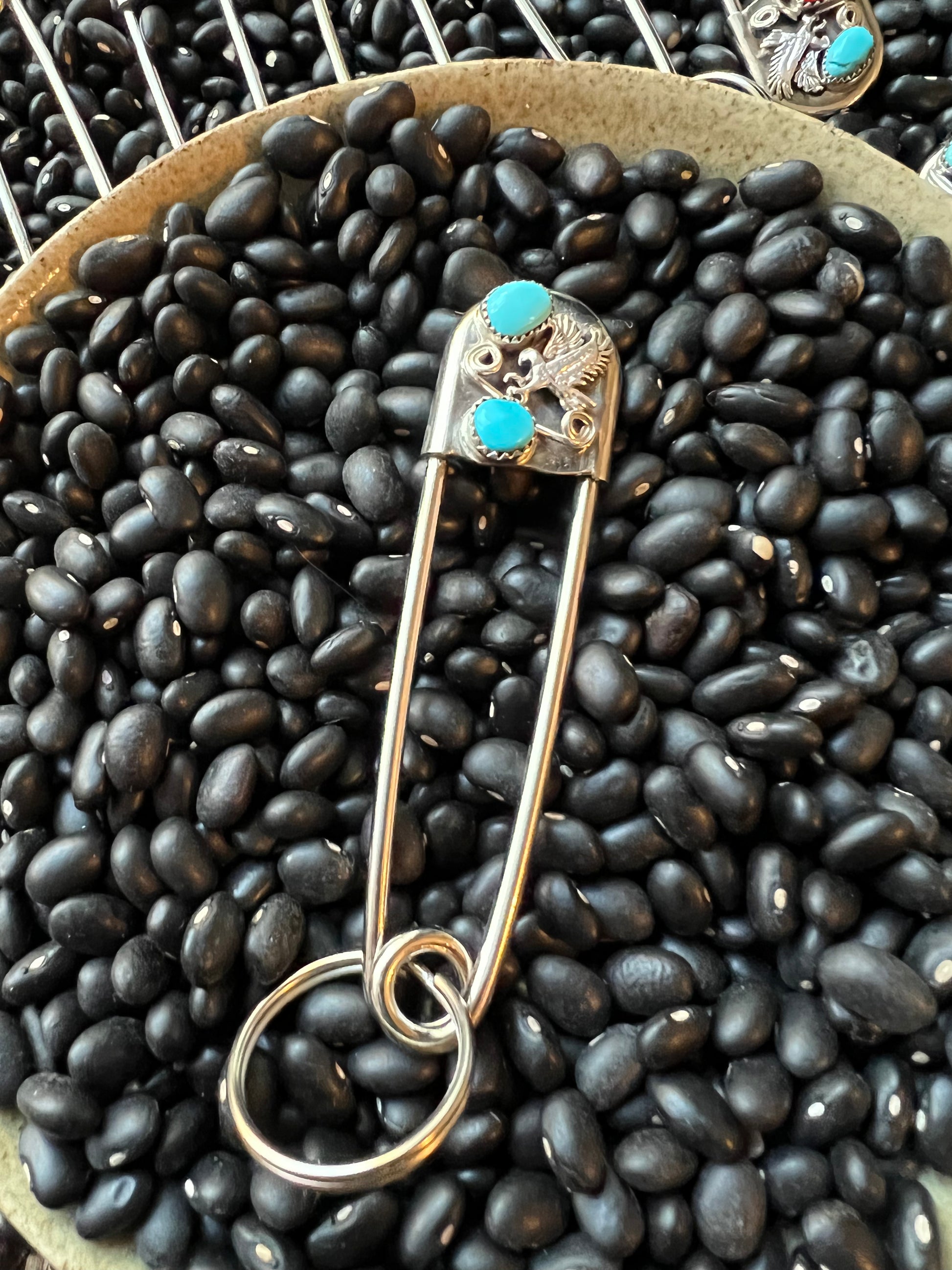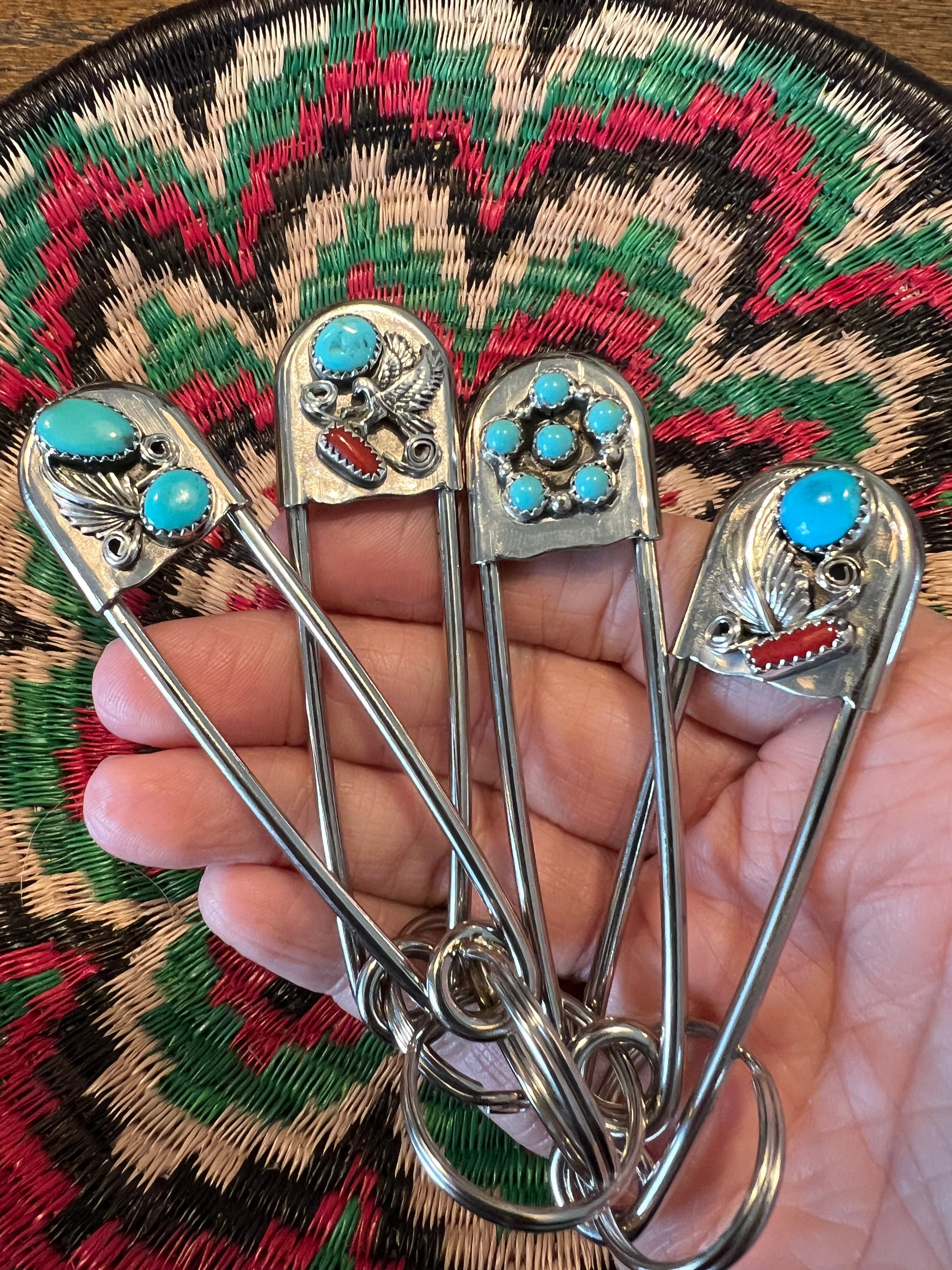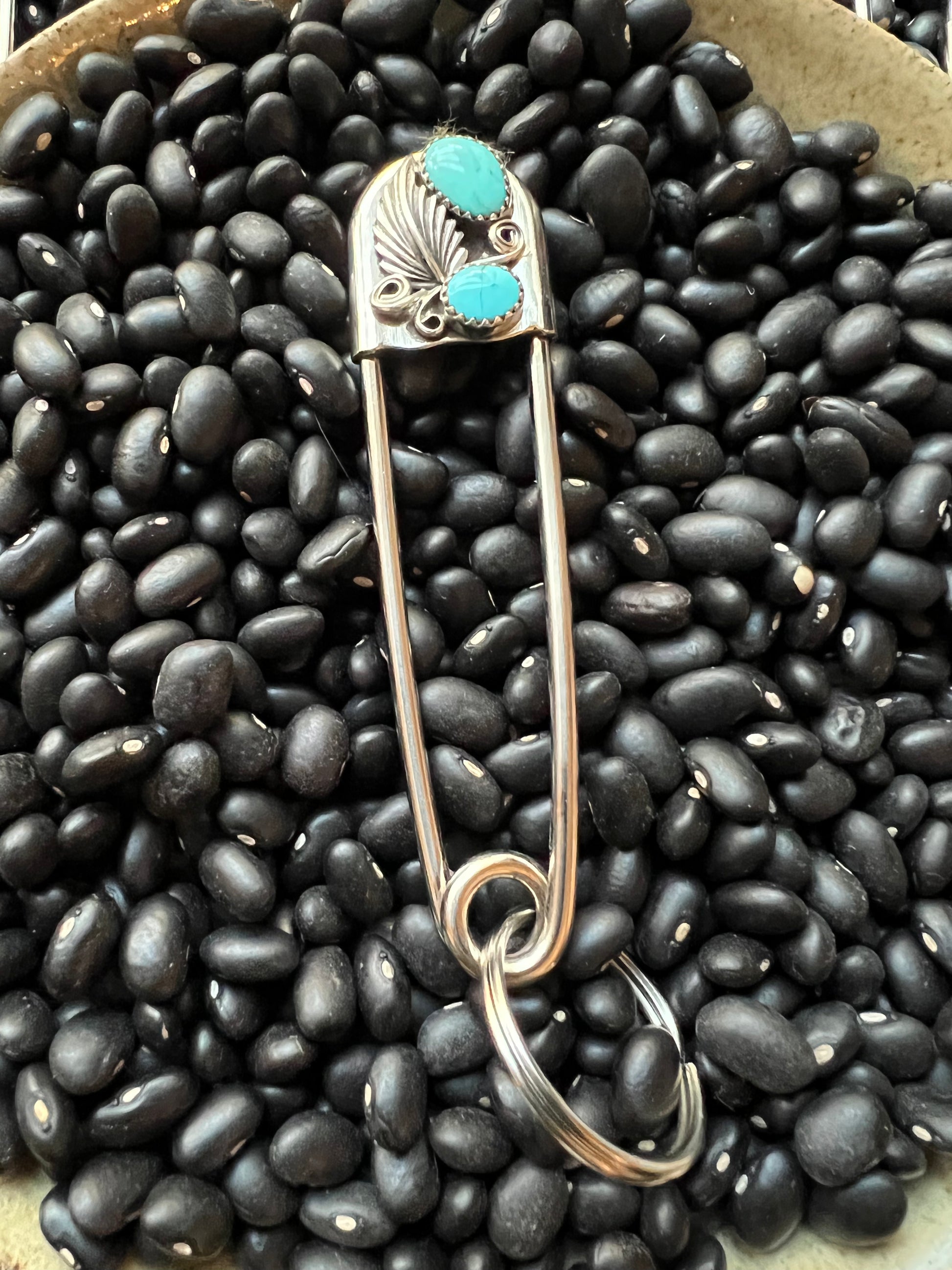 Native American made giant safety pin keychain . Perfect to add To your turquoise collection and keep your keys ! sterling silver