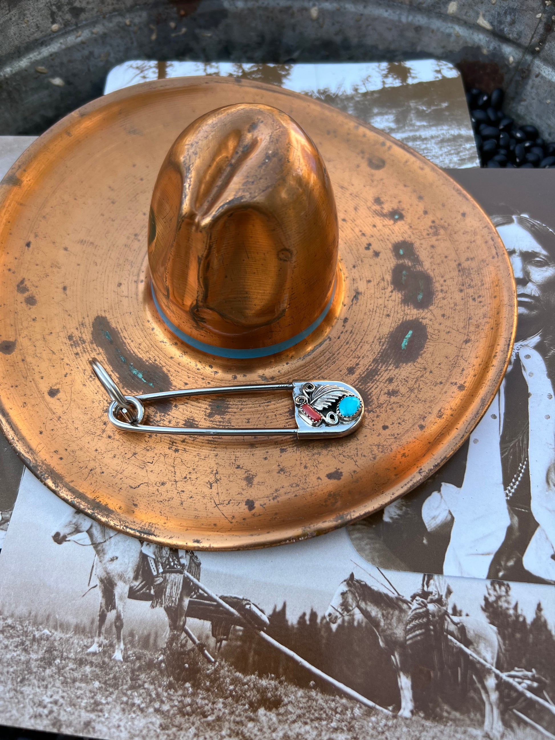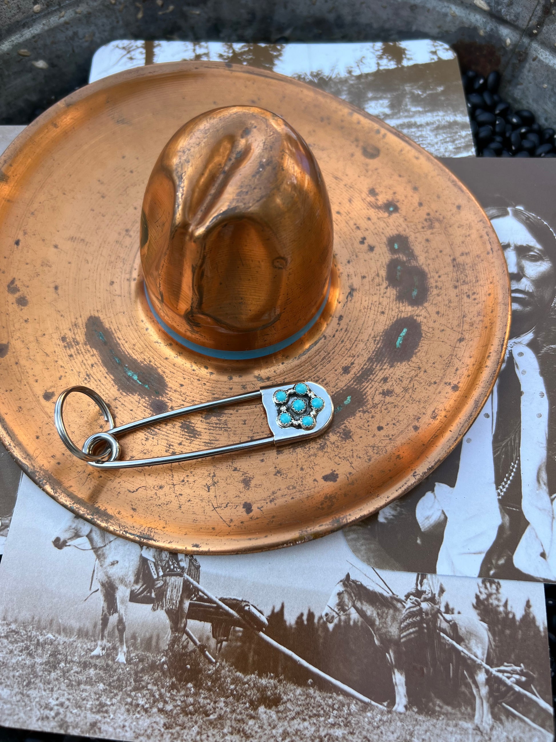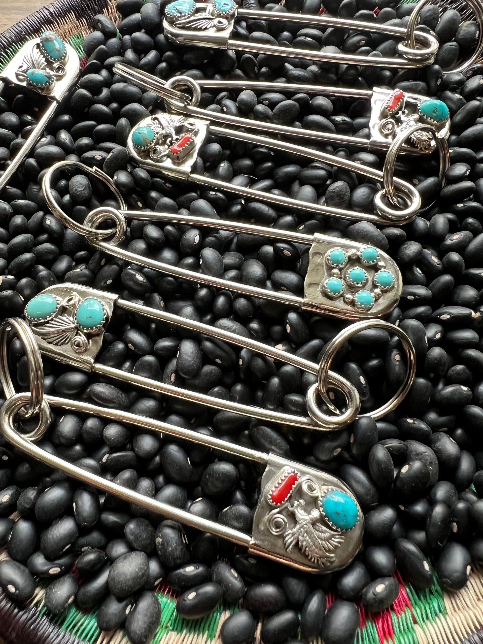 Native American made giant safety pin keychain . Perfect to add To your turquoise collection and keep your keys ! sterling silver