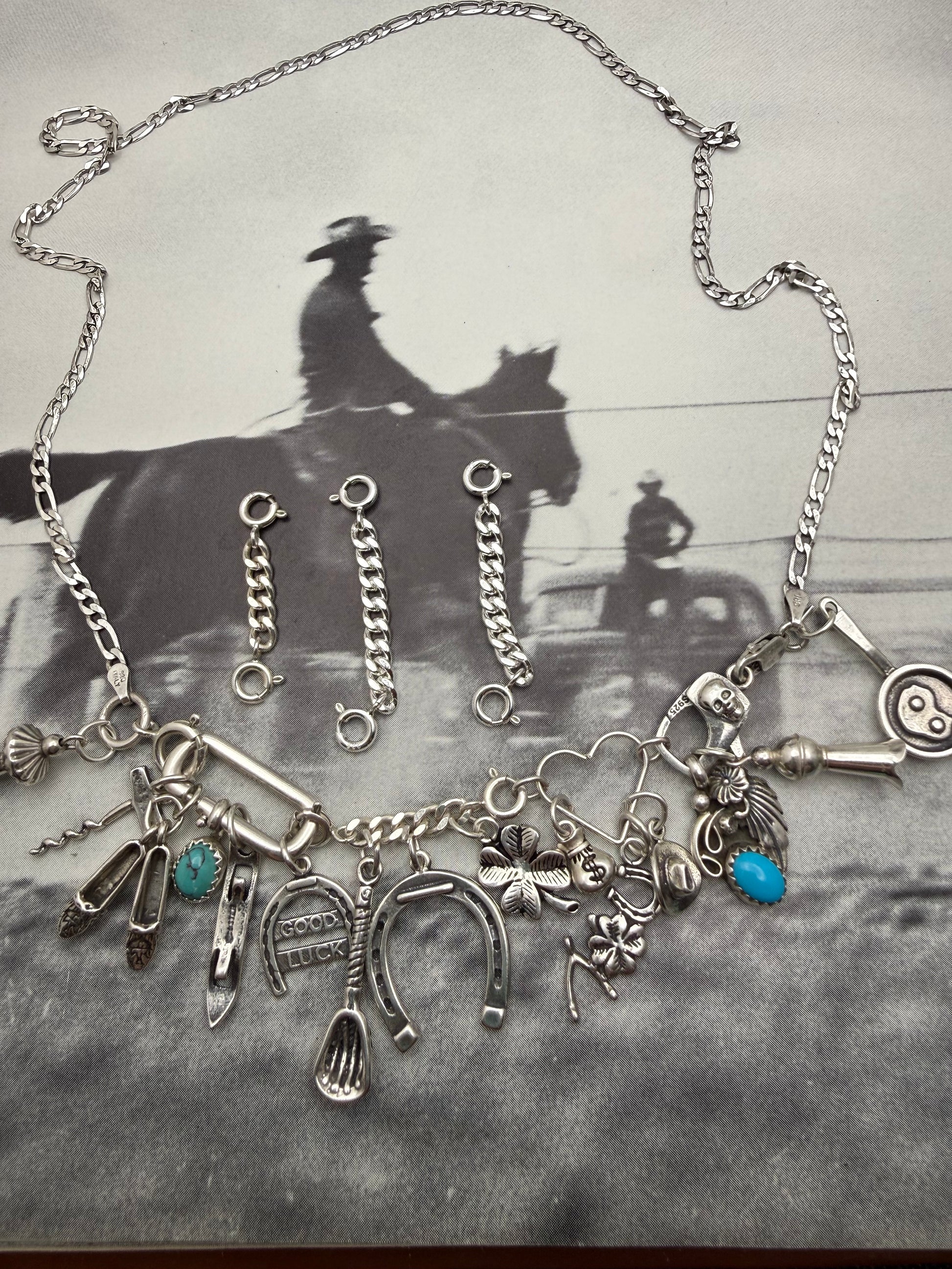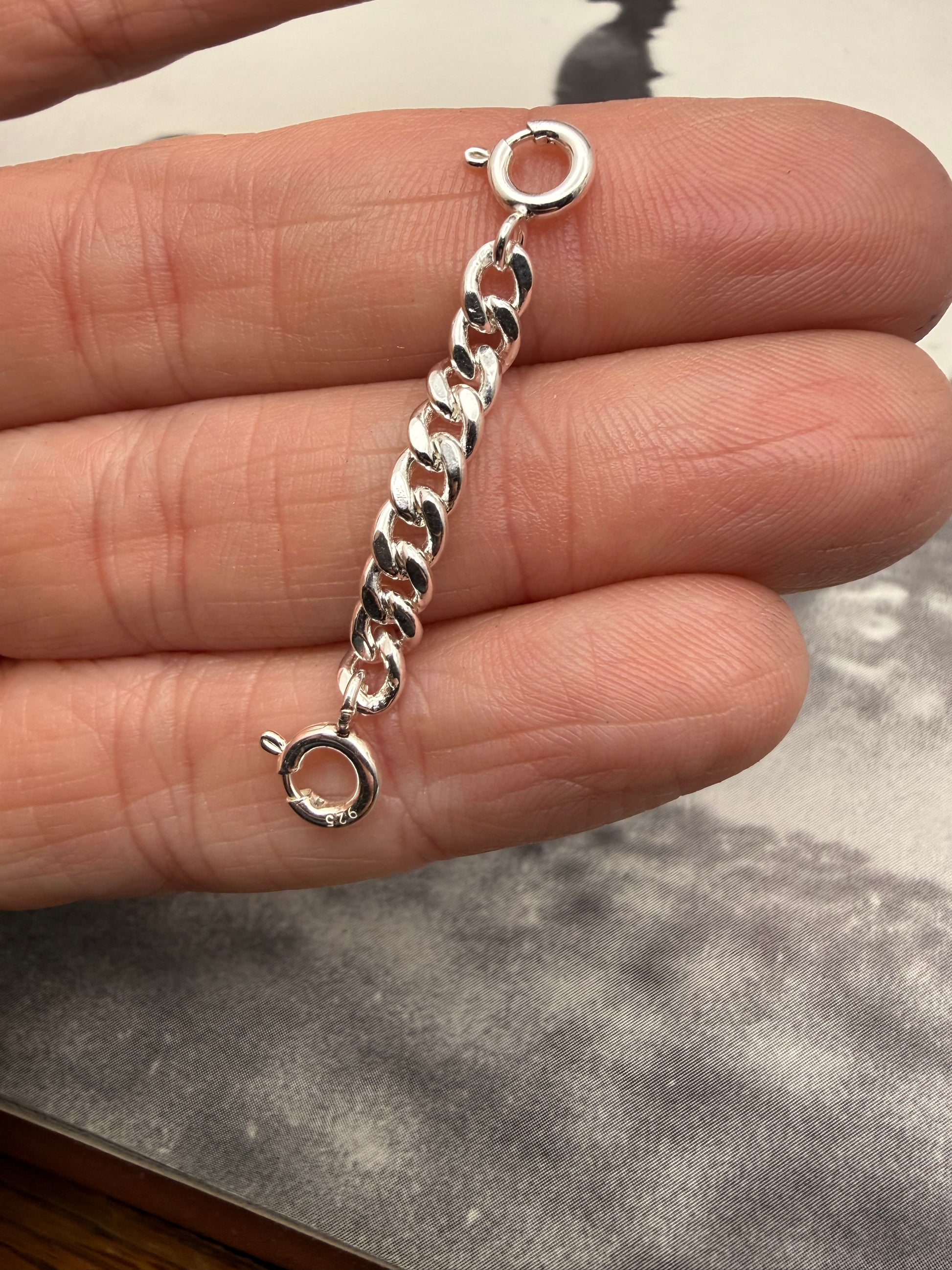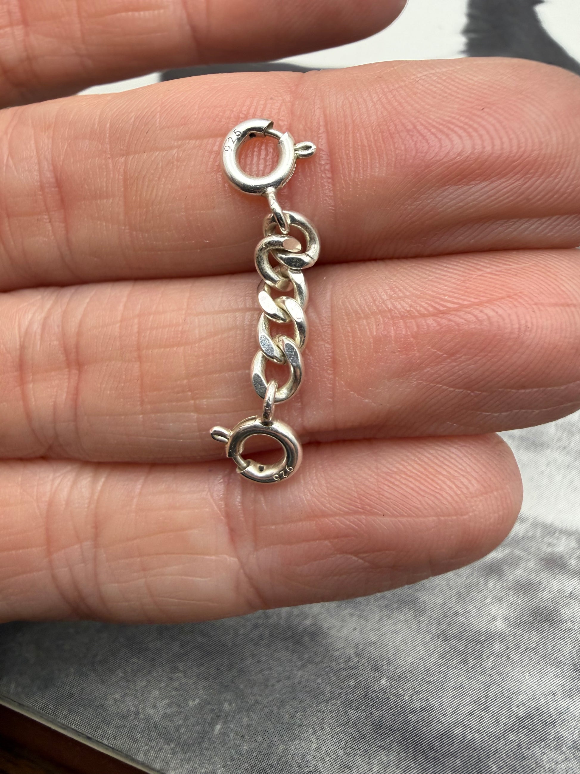 sterling silver curb style chain with two spring clasps to extend necklaces and add charms as well. (As pictured )
